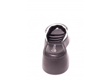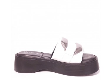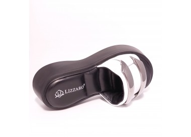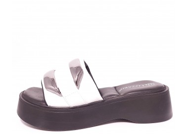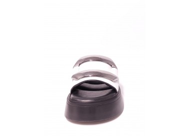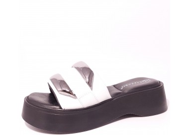 Sieviešu iešļūcenes uz platformas. Virspuses materiāls un iekšējā odere – dabīgā āda. Ļoti mīksta iekšzole. Metāliskās krāsas aksesuārs.