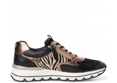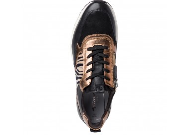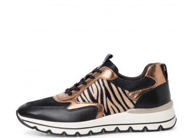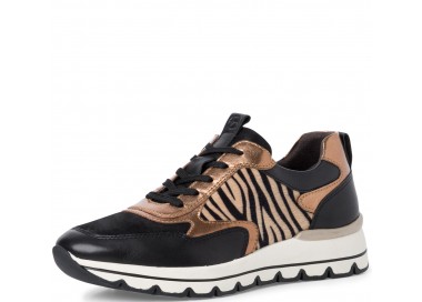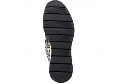 Tamaris sieviešu krosenes no ādas, tekstila un sintētikas, ar zebras printu. Iekšpusē kurpes sastāv no ādas un tekstila, iekšzole - ādas. Pēdu fiksē rāvējslēdzējs un šņores. Modelis ir no Pure Relax līnijas, ērtas un ar labu platumu, iekšzoli var izņemt. Zoles augstums - 45 mm.