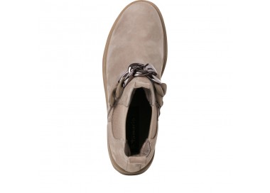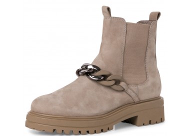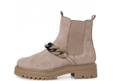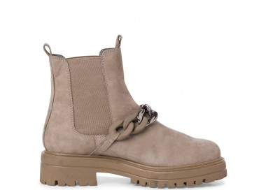 Женские ботинки c наружной отделкой из нубука. Посадку регулируют резинки. Внутренняя часть ботинок состоит из текстиля и синтетики, высота каблука 50 мм. У модели съёмная стелька, аксессуар - цепочка.