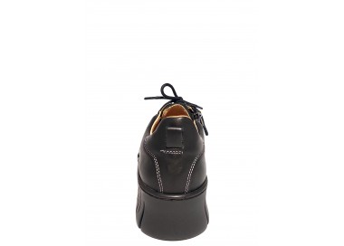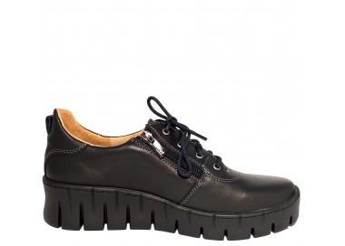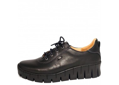 Женские закрытые туфли. Внешняя и внутренняя отделка - натуральная кожа. Высота танкетки – 44 мм. Стопу фиксирует молния, шнуровка позволяет выбрать нужную высоту подъема. Прошиты. У туфель очень мягкая, комфортная стелька, идеально подойдут для длительных прогулок.